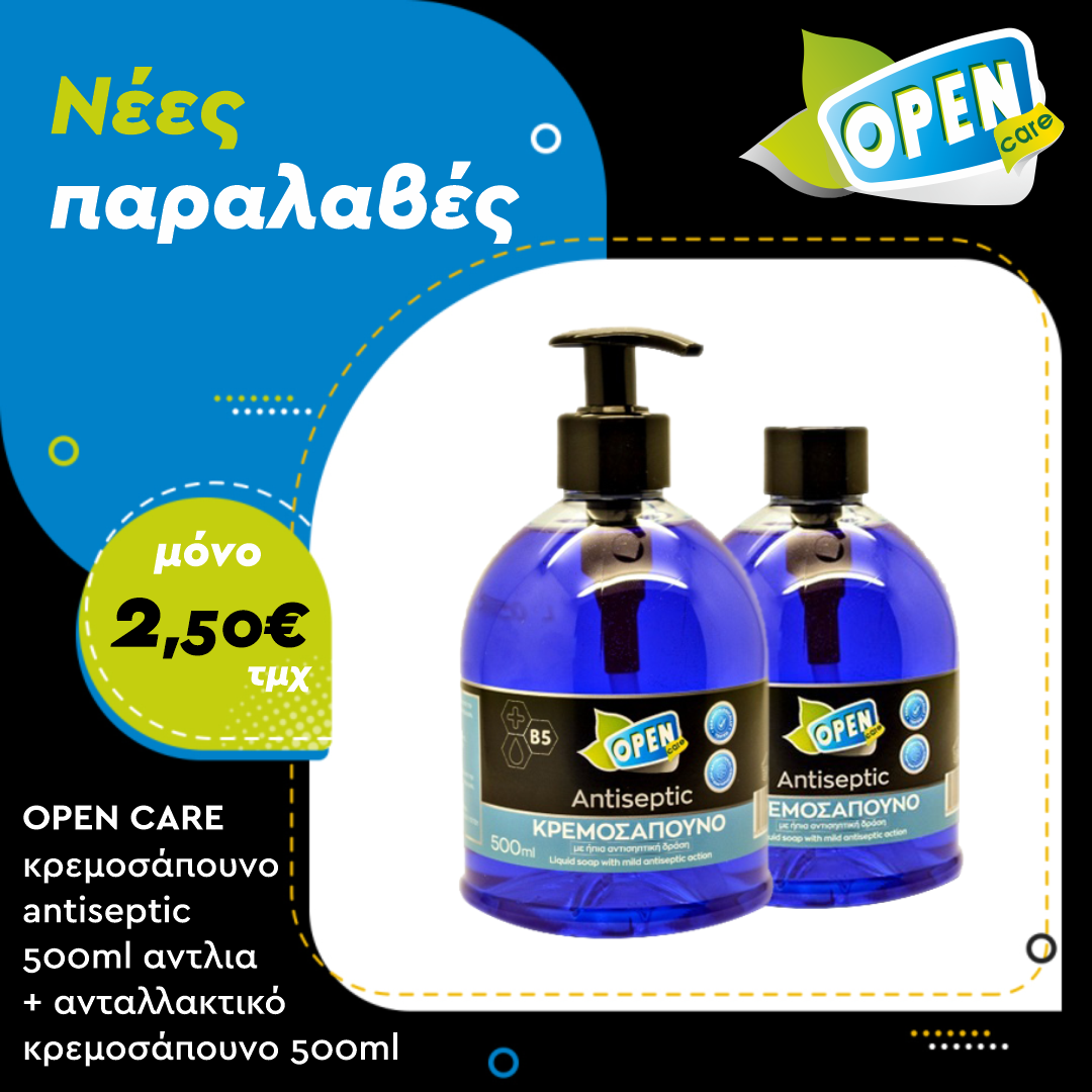 Νέες παραλαβές σε είδη απαραίτητα για την εποχή μας όπως αντισηπτικά χεριών, αντιβακτηριδιακά μαντηλάκια και κρεμοσάπουνα έφτασαν στο OPEN CARE σε απίστευτες τιμές!