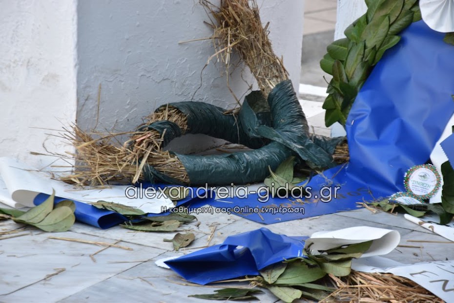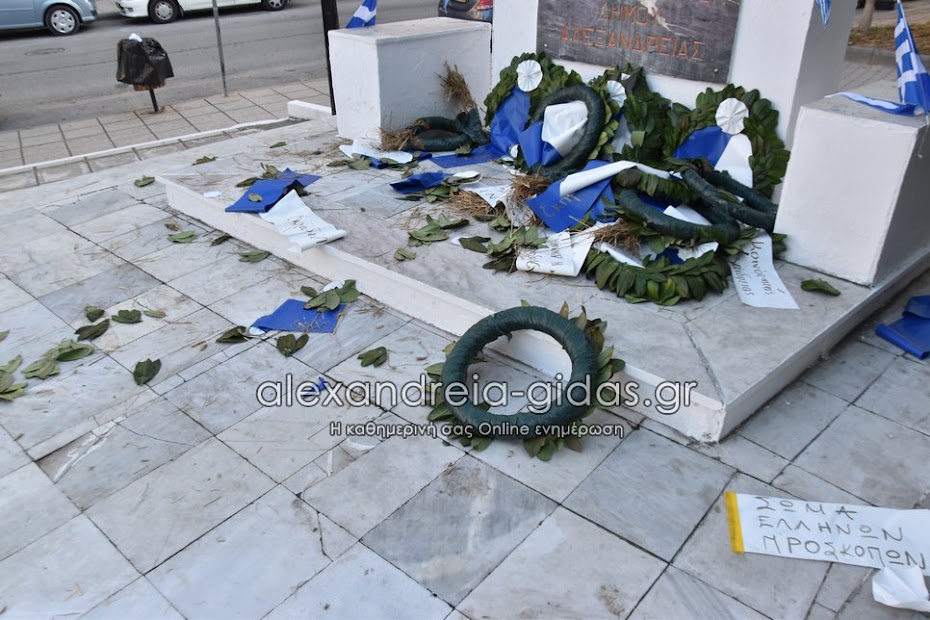 Πατημένα και σκισμένα στεφάνια, ένα από αυτά πάνω στο άγαλμα και εικόνες που μόνο εικόνες ντροπής μπορούν να χαρακτηριστούν.