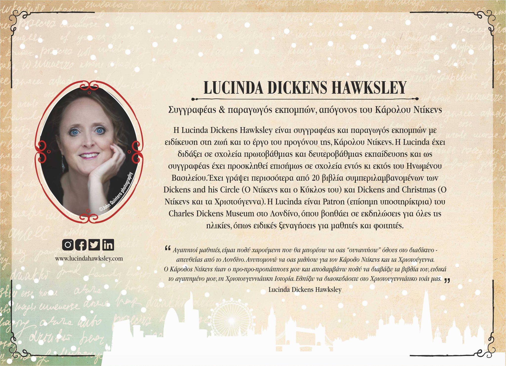 Οι μαθητές θα συνδεθούν ζωντανά με τη διάσημη συγγραφέα, Lucinda Dickens Hawksley. Θα μάθουν τη πραγματική ιστορία για τον Σκρούτζ και το διάσημο έργο «Χριστουγεννιάτικη Ιστορία» και οι μαθητές θα συζητήσουν στα Αγγλικά για τα Βικτωριανά Χριστούγεννα του Λονδίνου και για τον Κάρολο Ντίκενς!