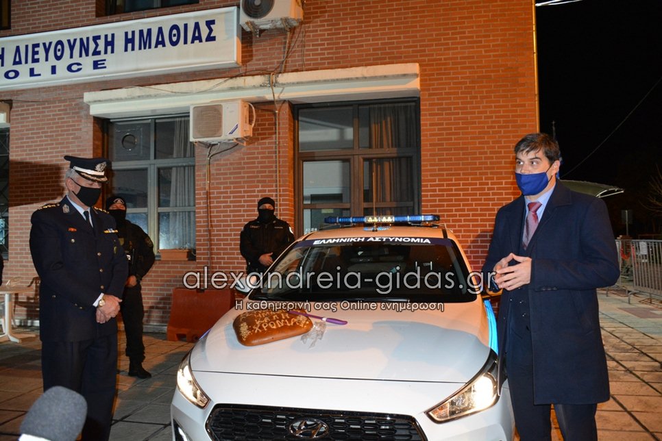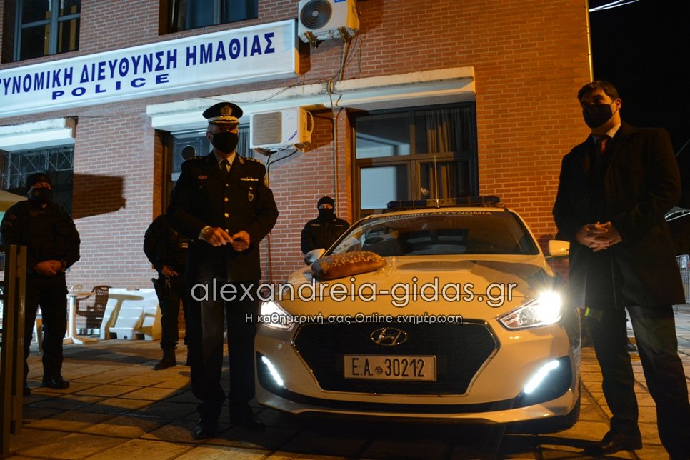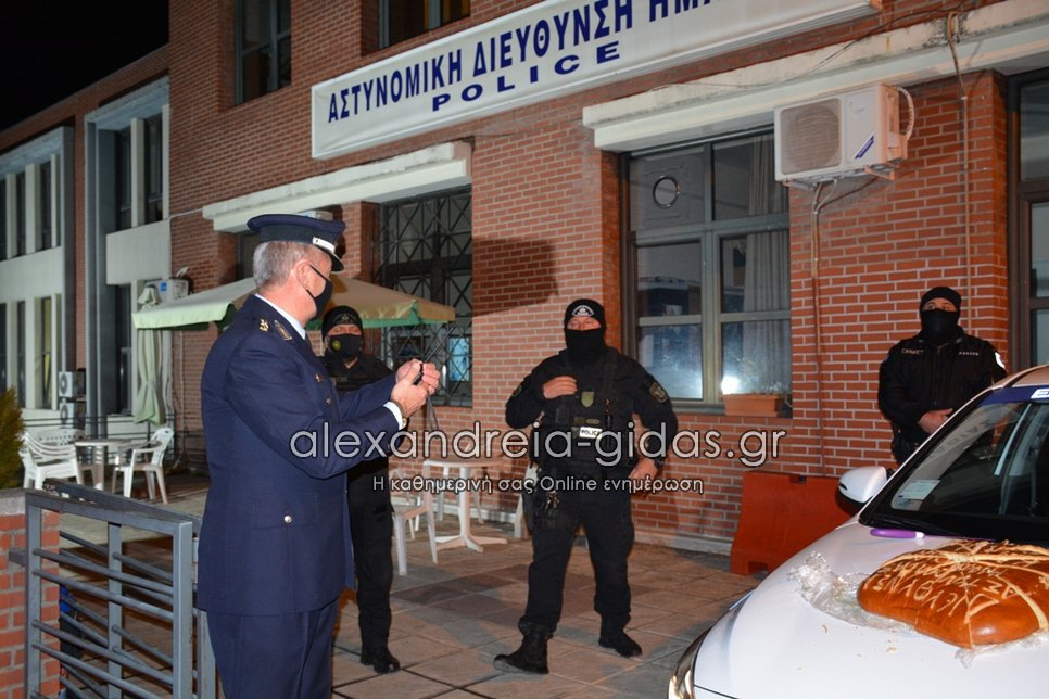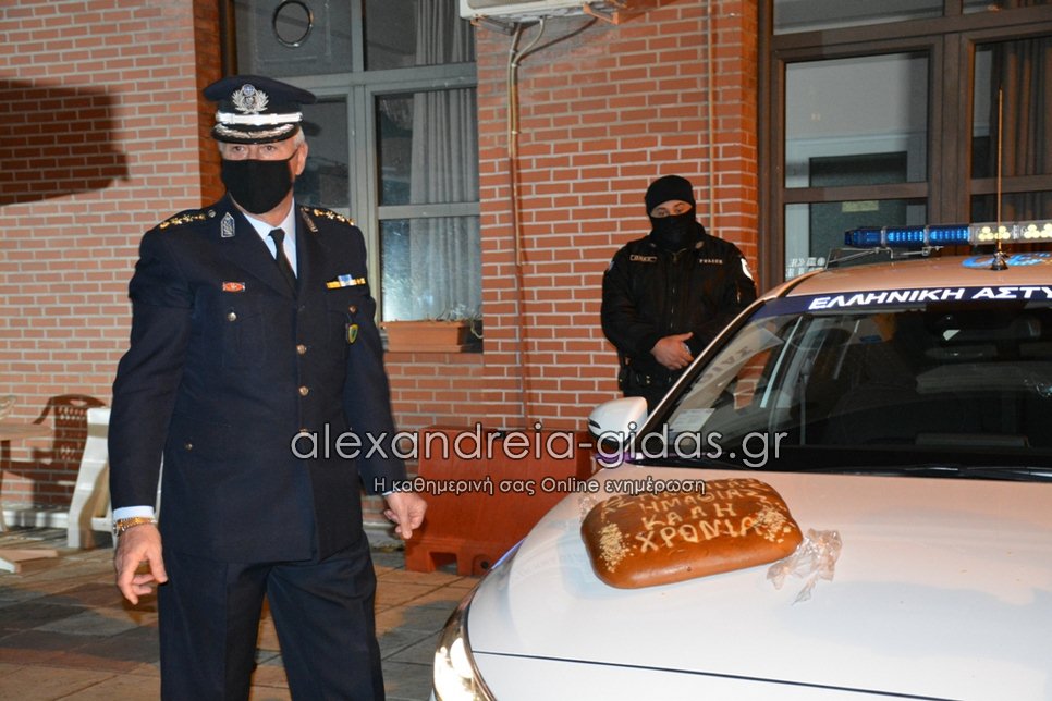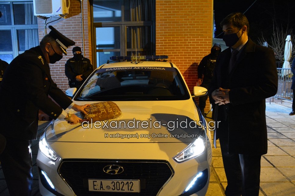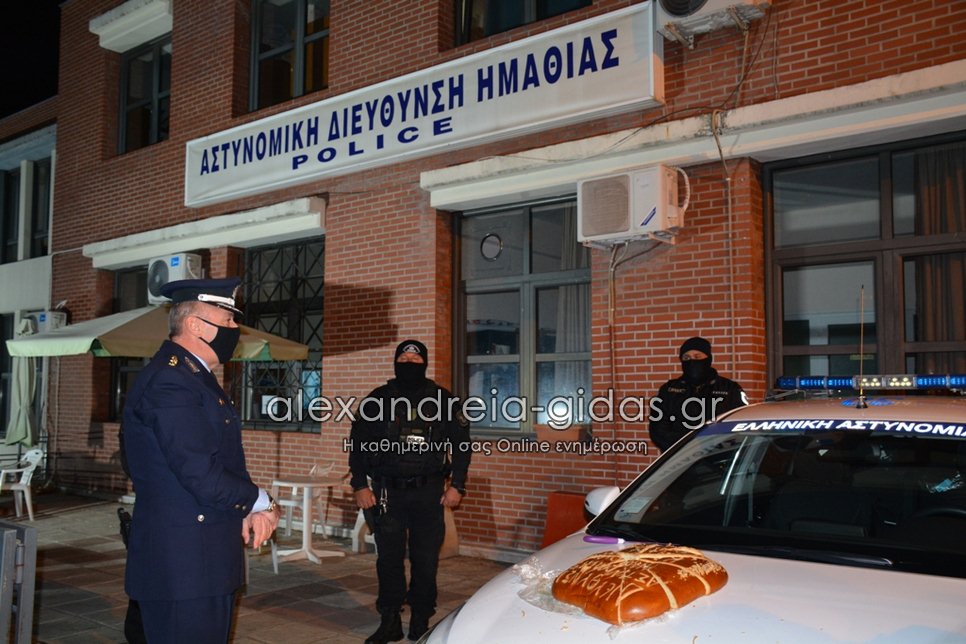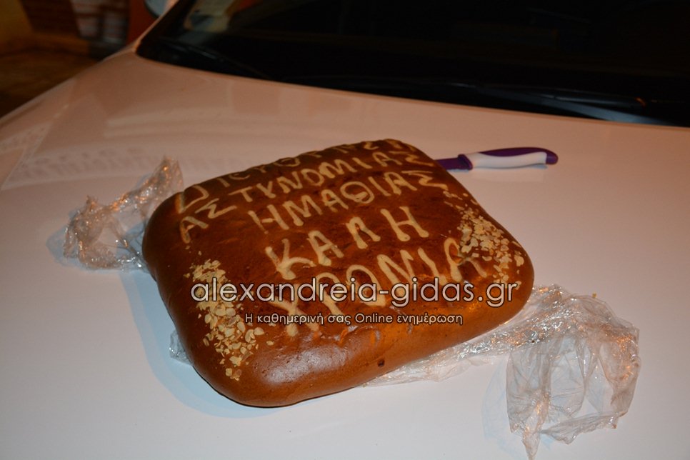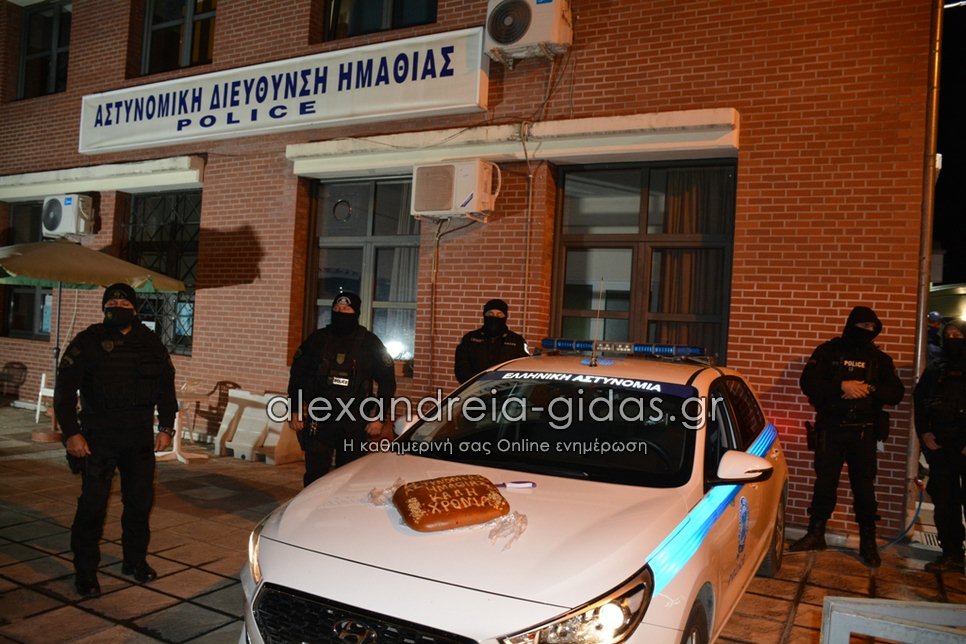 Όπως προστάζει το έθιμο, η πίτα κόπηκε στο καπό ενός περιπολικού, από τον Αστυνομικό Διευθυντή Ημαθίας Διονύσιο Κούγκα και τον πρόεδρο της Ένωσης Αστυνομικών Υπαλλήλων Ημαθίας Απόστολο Μούρτη.
