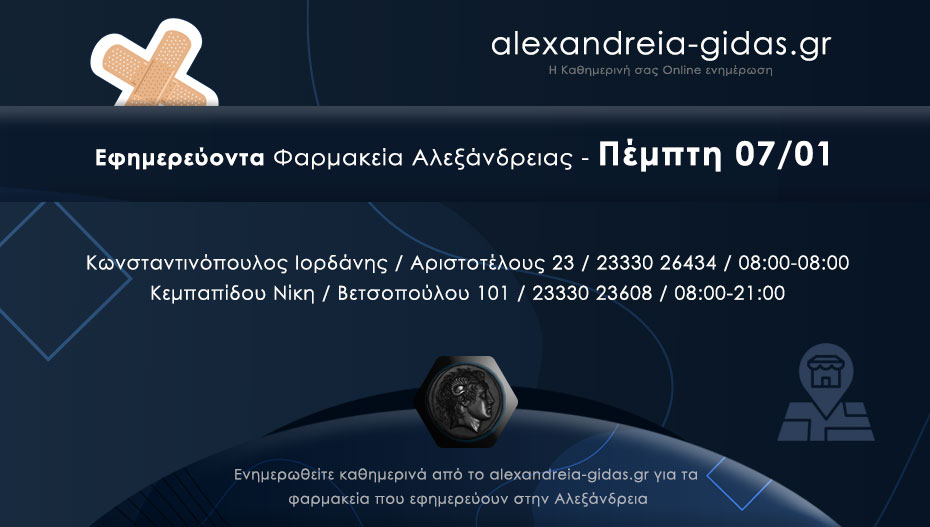 ΦΑΡΜΑΚΕΙΑ 7 Ιανουαρίου, 2021 posted by admin Share Ποια φαρμακεία εφημερεύουν – διανυκτερεύουν σήμερα Πέμπτη στην Αλεξάνδρεια Αλεξάνδρεια: Αφήστε μια απάντηση Ακύρωση απάντησηςΗ ηλ. διεύθυνση σας δεν δημοσιεύεται. Τα υποχρεωτικά πεδία σημειώνονται με *Σχόλιο * Όνομα Email Ιστότοπος Αποθήκευσε το όνομά μου, email, και τον ιστότοπο μου σε αυτόν τον πλοηγό για την επόμενη φορά που θα σχολιάσω.