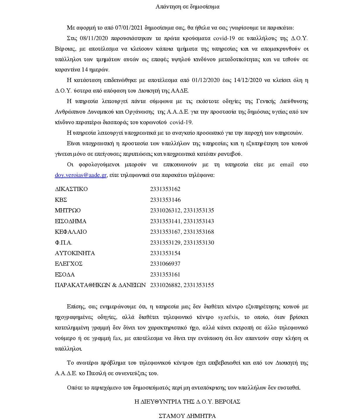 Απάντηση – ενημέρωση σχετικά με το δημοσίευμα που έγινε στο Αλεξάνδρεια-Γιδάς στις 7 Ιανουαρίου 2021 (κλικ ΕΔΩ) απέστειλε η ΔΟΥ Βέροιας.