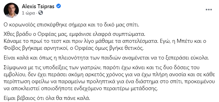 Μέσω της προσωπικής του σελίδα στο Facebook ο Αλέξης Τσίπρας αποκάλυψε πως ο γιος του Ορφέας διαγνώστηκε θετικός στον κορονοϊό.
