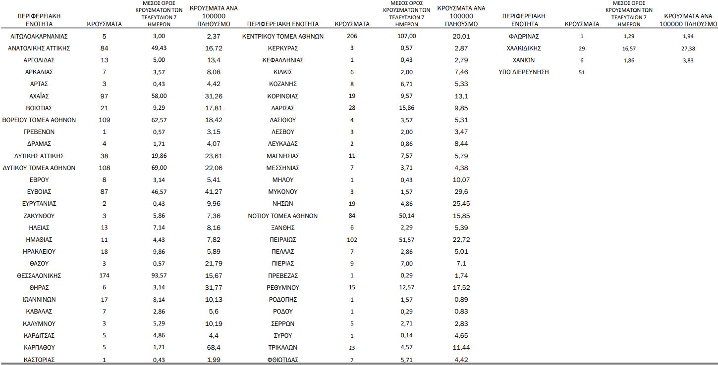 Σήμερα ανακοινώνουμε 1526 νέα κρούσματα της λοίμωξης του νέου κορωνοϊού (COVID-19), εκ των οποίων 9 εντοπίστηκαν κατόπιν ελέγχων στις πύλες εισόδου της χώρας. Ο συνολικός αριθμός των κρουσμάτων ανέρχεται στα 166067, εκ των οποίων 51.9% άνδρες. Κατά την ιχνηλάτιση βρέθηκε ότι 6061 (3.6%) θεωρούνται σχετιζόμενα με ταξίδι από το εξωτερικό και 52913 (61.0%) είναι σχετιζόμενα με ήδη γνωστό κρούσμα.