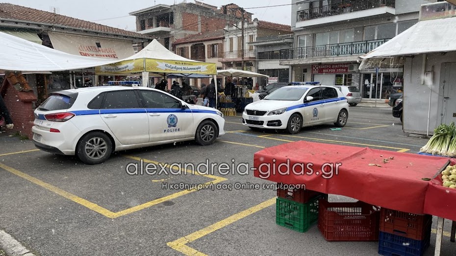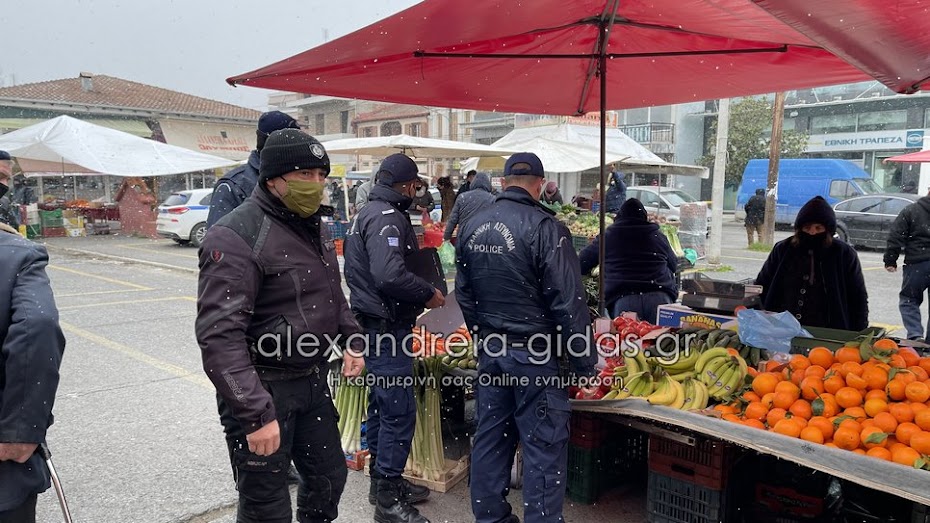 Στο χιονισμένο παζάρι της Αλεξάνδρειας βρέθηκαν το πρωί του Σαββάτου 13 Φεβρουαρίου 2021 οι αστυνομικοί.
