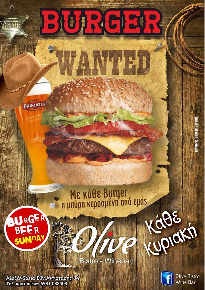 Να απολαύσουμε λαχταριστές γεύσεις burger μας προσκαλεί όπως κάθε Κυριακή έτσι και σήμερα το OLIVE Bistro στον πεζόδρομο της Αλεξάνδρειας.
