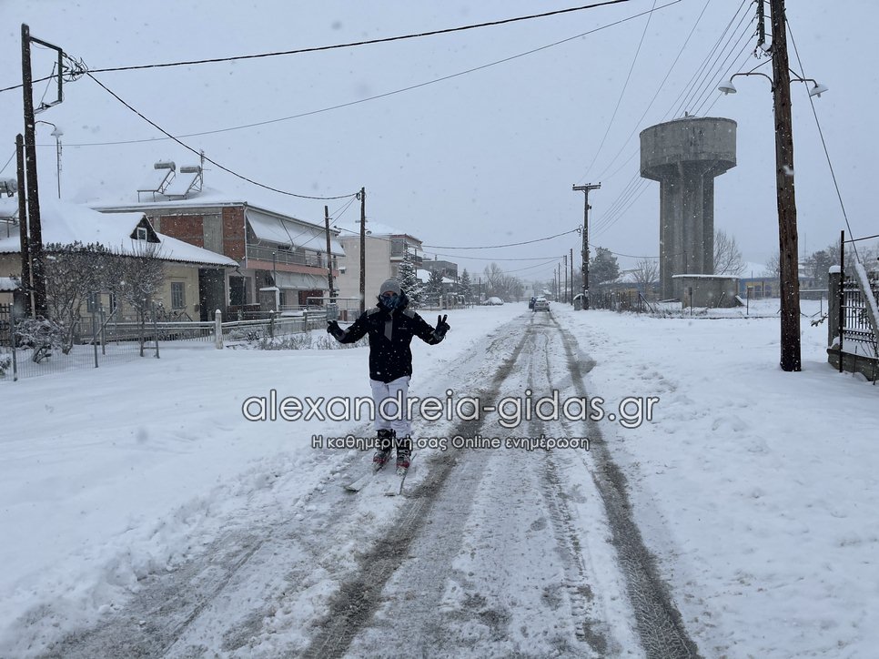 Ο προπονητής σκι του ΓΑΣ Αλεξάνδρειας Δημοσθένης Ναλμπάντης από τις 6 το πρωί με την παρέα του έκαναν σκι στους χιονισμένους δρόμους της πόλης.