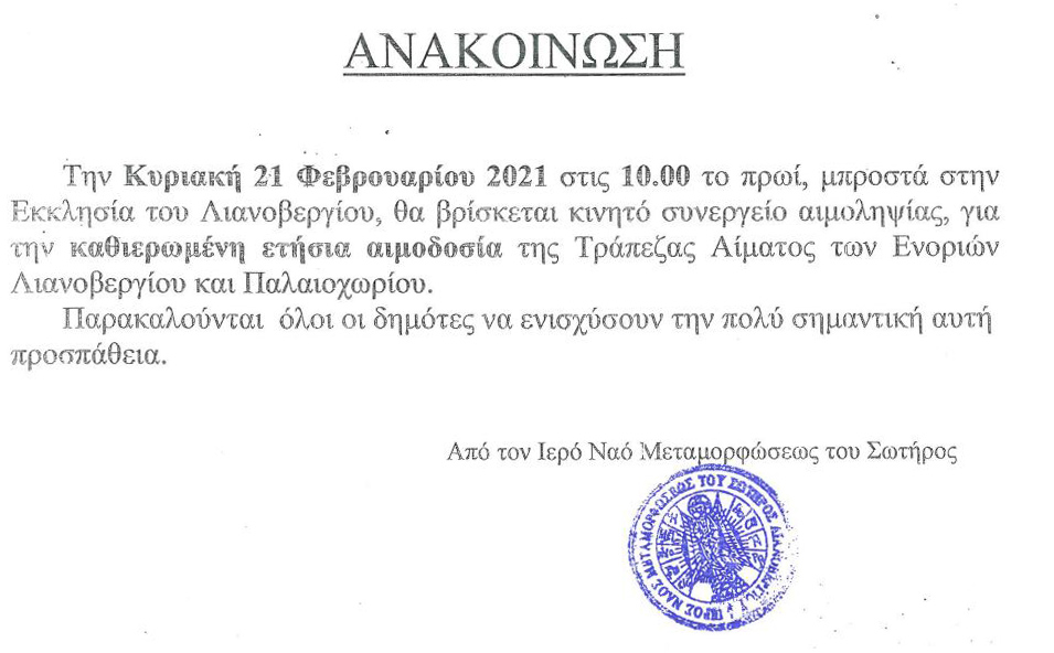 Από τον Ιερό Ναό Μεταμορφώσεως του Σωτήρος Λιανοβεργίου ανακοινώθηκε: