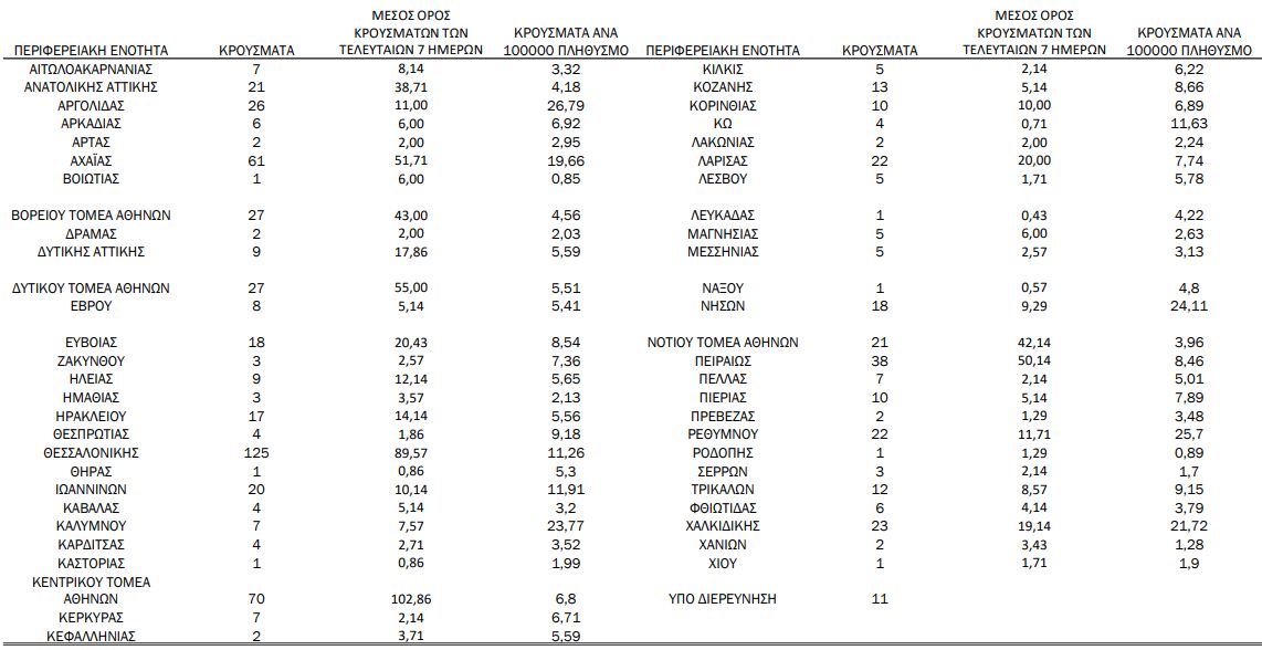 Με βάση τα επιβεβαιωμένα κρούσματα των τελευταίων 7 ημερών, 52 θεωρούνται σχετιζόμενα με ταξίδι από το εξωτερικό και 1558 είναι σχετιζόμενα με ήδη γνωστό κρούσμα.
