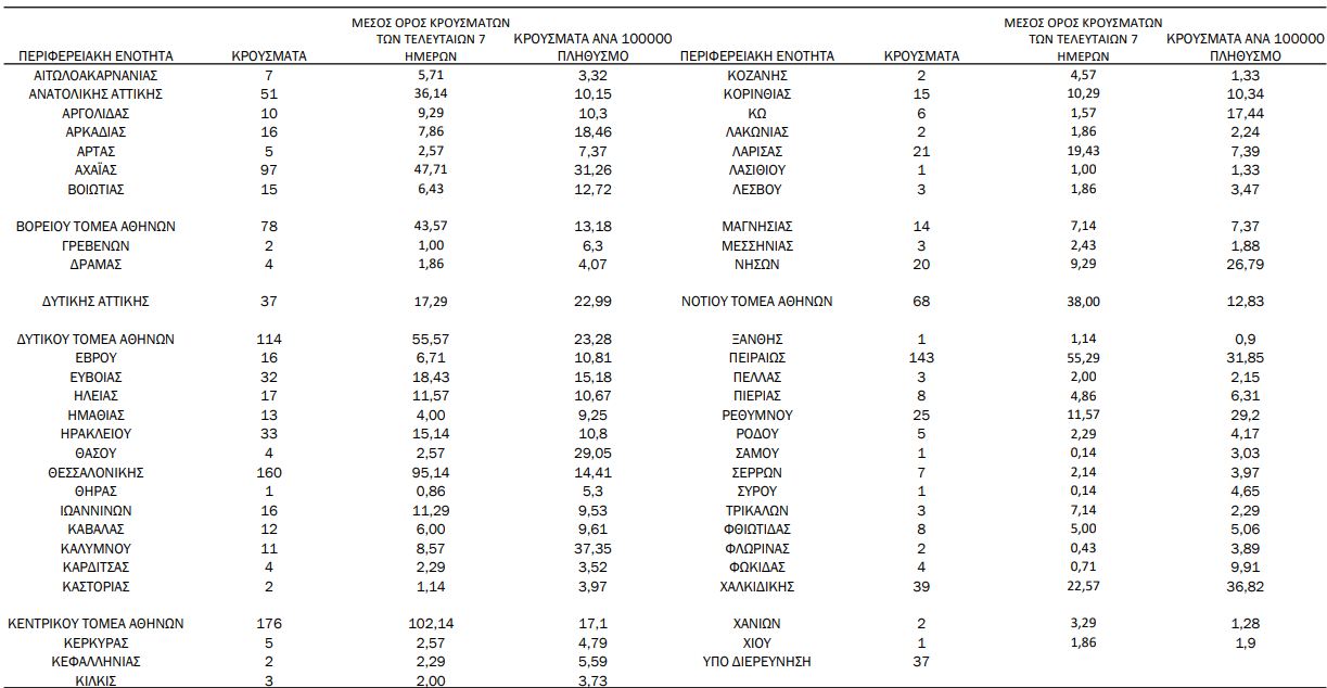 Με βάση τα επιβεβαιωμένα κρούσματα των τελευταίων 7 ημερών, 50 θεωρούνται σχετιζόμενα με ταξίδι από το εξωτερικό και 1497 είναι σχετιζόμενα με ήδη γνωστό κρούσμα.