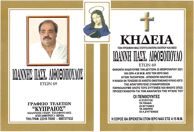 Σήμερα Δευτέρα 22 Φεβρουαρίου 2021 θα γίνει η κηδεία του Ιωάννη Λιθοξόπουλου.