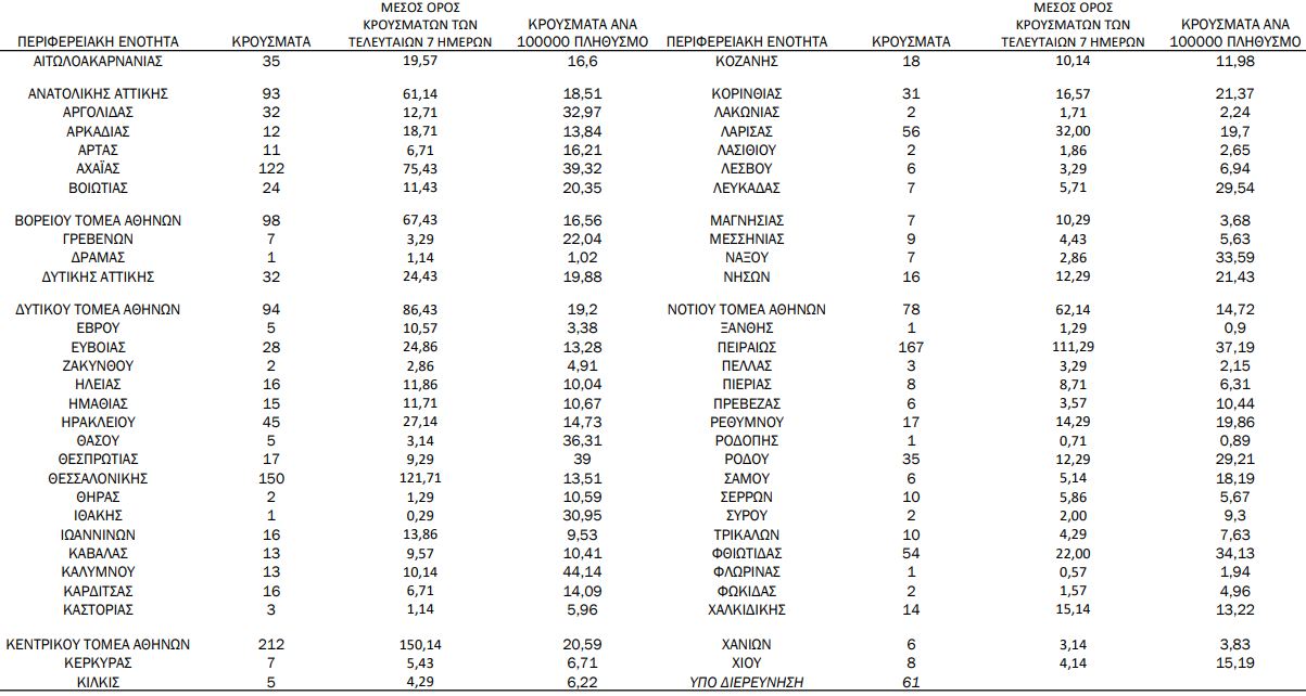 Με βάση τα επιβεβαιωμένα κρούσματα των τελευταίων 7 ημερών, 62 θεωρούνται σχετιζόμενα με ταξίδι από το εξωτερικό και 2.462 είναι σχετιζόμενα με ήδη γνωστό κρούσμα.