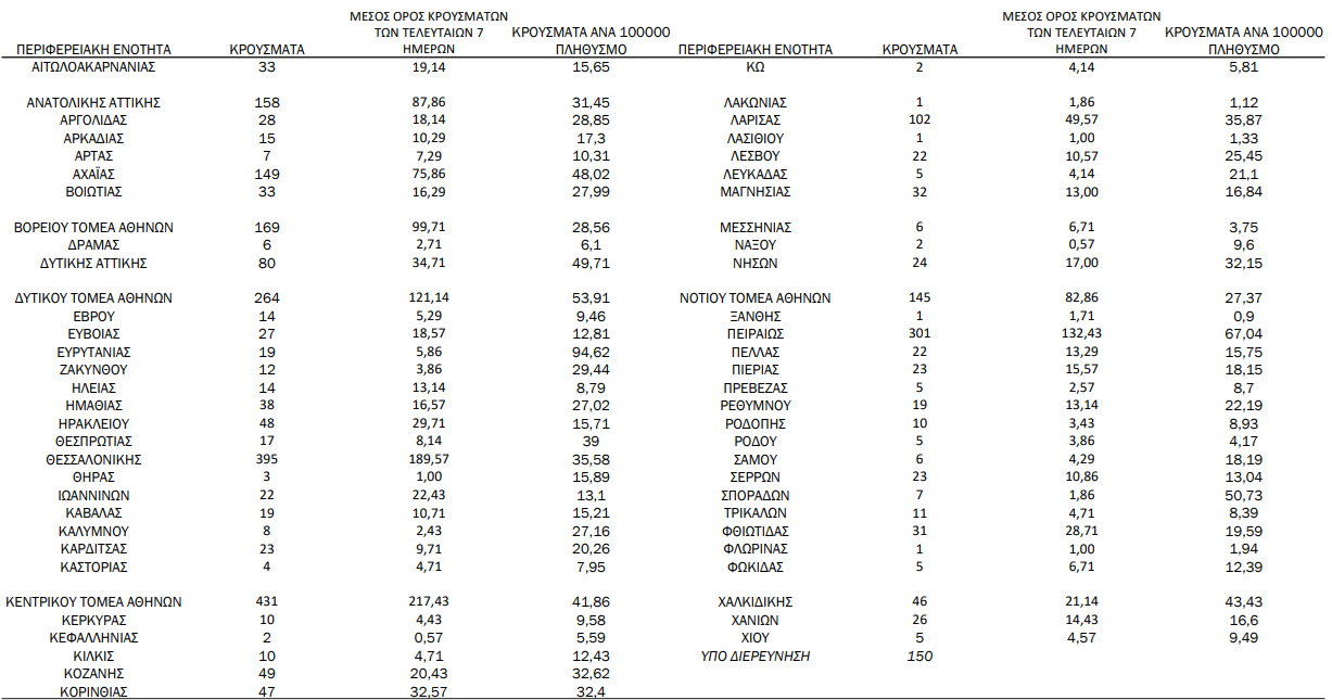 Με βάση τα επιβεβαιωμένα κρούσματα των τελευταίων 7 ημερών, 74 θεωρούνται σχετιζόμενα με ταξίδι από το εξωτερικό και 2.769 είναι σχετιζόμενα με ήδη γνωστό κρούσμα.