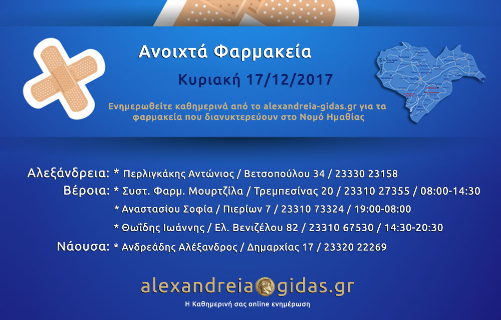 ΤΟΠΙΚΑ 17 Δεκεμβρίου, 2017 posted by admin Share Ανοιχτά φαρμακεία Ημαθίας Κυριακή 17 Δεκεμβρίου Αλεξάνδρεια: Αφήστε μια απάντηση Ακύρωση απάντησηςΗ ηλ. διεύθυνση σας δεν δημοσιεύεται. Τα υποχρεωτικά πεδία σημειώνονται με *Σχόλιο * Όνομα Email Ιστότοπος Αποθήκευσε το όνομά μου, email, και τον ιστότοπο μου σε αυτόν τον πλοηγό για την επόμενη φορά που θα σχολιάσω.