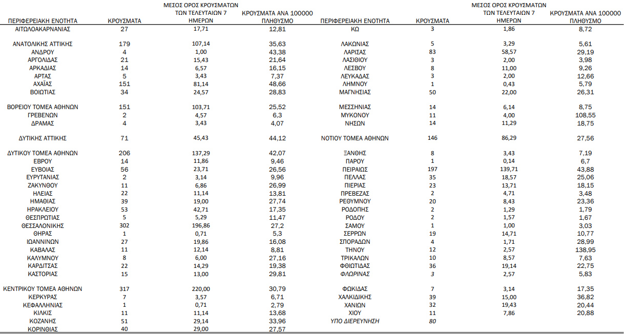 Με βάση τα επιβεβαιωμένα κρούσματα των τελευταίων 7 ημερών, 75 θεωρούνται σχετιζόμενα με ταξίδι από το εξωτερικό και 2.101 είναι σχετιζόμενα με ήδη γνωστό κρούσμα.