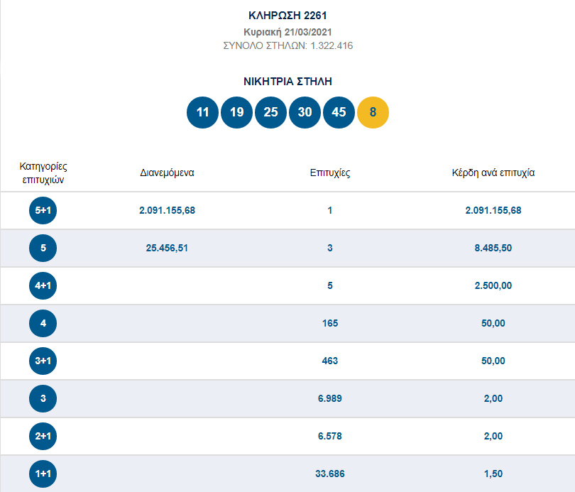 Ο μοναδικός νικητής στην κατηγορία των 5+1 αριθμών κερδίζει πάνω από 2 εκατομμύρια ευρώ ύστερα από συνεχόμενα τζακ ποτ.