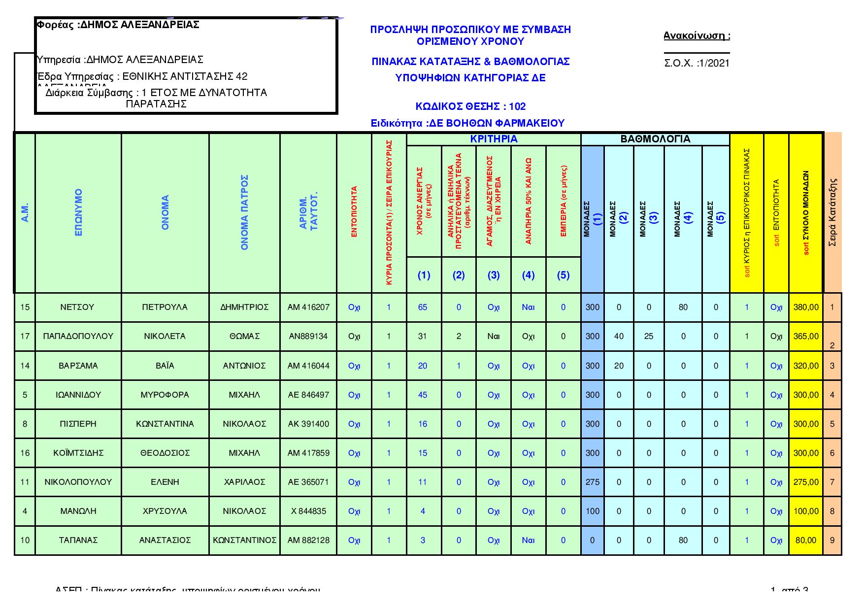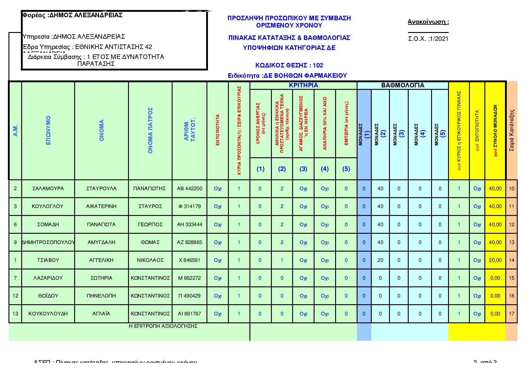 Πίνακας κατάταξης ΔΕ Βοηθών Φαρμακείου