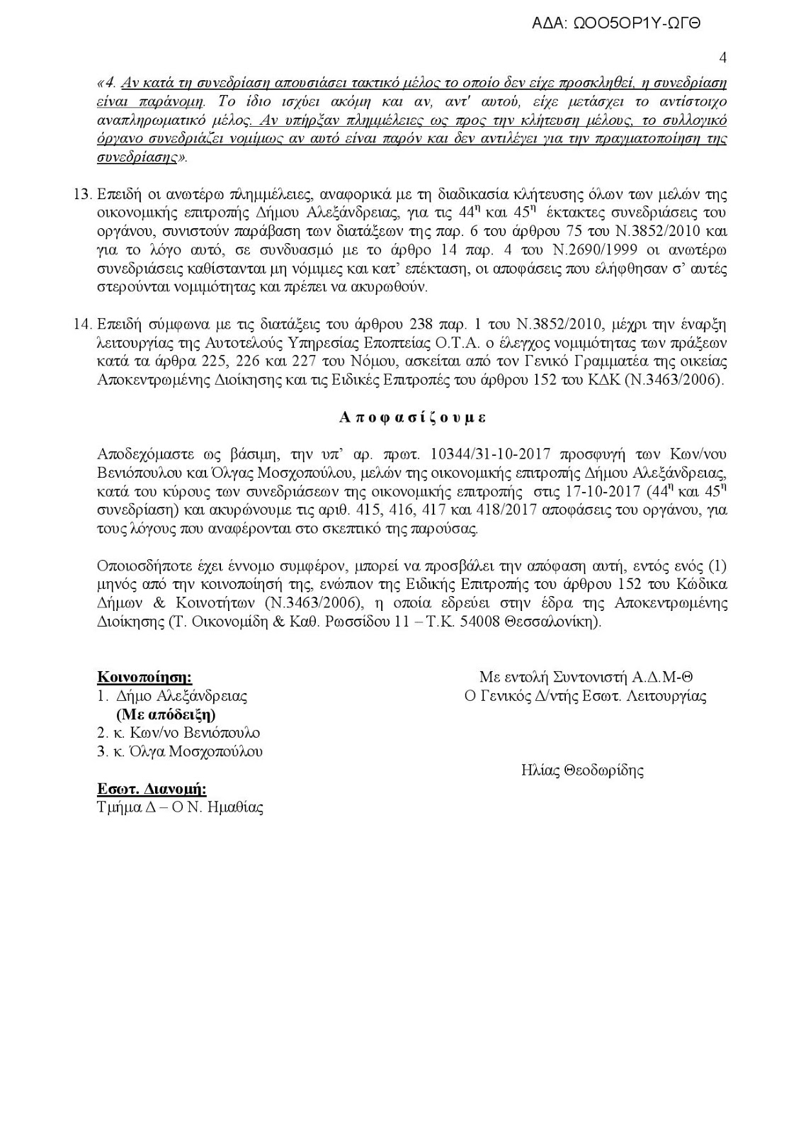 Αποδεχόμαστε ως βάσιμη, την υπ’ αρ. πρωτ. 10344/31-10-2017 προσφυγή των Κων/νου Βενιόπουλου και Όλγας Μοσχοπούλου, μελών της οικονομικής επιτροπής Δήμου Αλεξάνδρειας, κατά του κύρους των συνεδριάσεων της οικονομικής επιτροπής στις 17-10-2017 (44η και 45η συνεδρίαση) και ακυρώνουμε τις αριθ. 415, 416, 417 και 418/2017 αποφάσεις του οργάνου, για τους λόγους που αναφέρονται στο σκεπτικό της παρούσας.