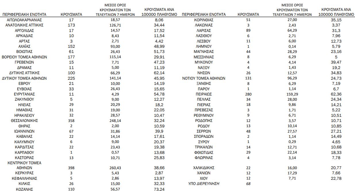 Με βάση τα επιβεβαιωμένα κρούσματα των τελευταίων 7 ημερών, 60 θεωρούνται σχετιζόμενα με ταξίδι από το εξωτερικό και 2.545 είναι σχετιζόμενα με ήδη γνωστό κρούσμα.