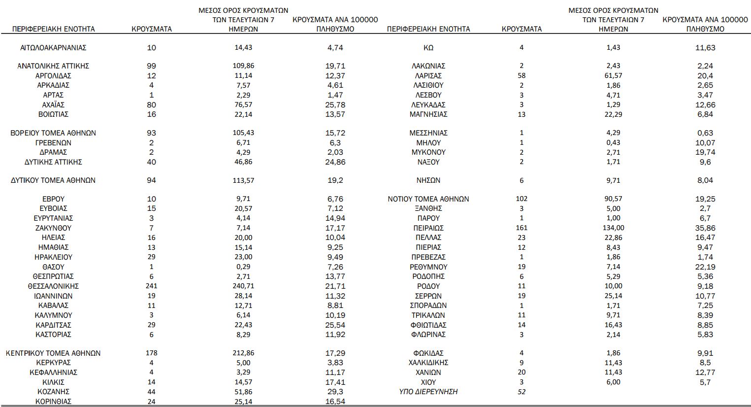 Με βάση τα επιβεβαιωμένα κρούσματα των τελευταίων 7 ημερών, 72 θεωρούνται σχετιζόμενα με ταξίδι από το εξωτερικό και 2.162 είναι σχετιζόμενα με ήδη γνωστό κρούσμα.