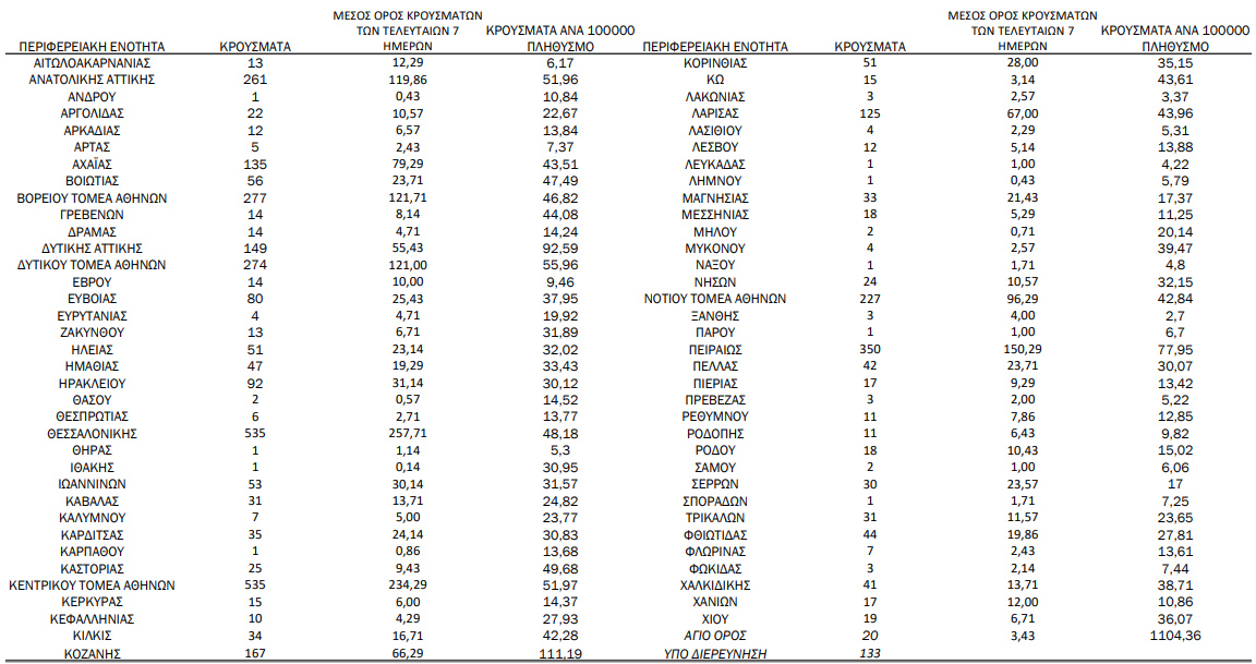 Με βάση τα επιβεβαιωμένα κρούσματα των τελευταίων 7 ημερών, 86 θεωρούνται σχετιζόμενα με ταξίδι από το εξωτερικό και 2.267 είναι σχετιζόμενα με ήδη γνωστό κρούσμα.