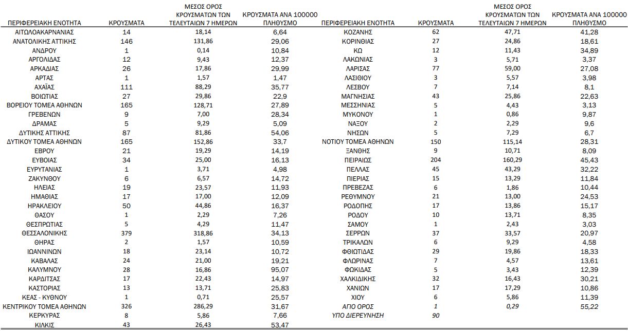 Με βάση τα επιβεβαιωμένα κρούσματα των τελευταίων 7 ημερών, 99 θεωρούνται σχετιζόμενα με ταξίδι από το εξωτερικό και 2.978 είναι σχετιζόμενα με ήδη γνωστό κρούσμα.