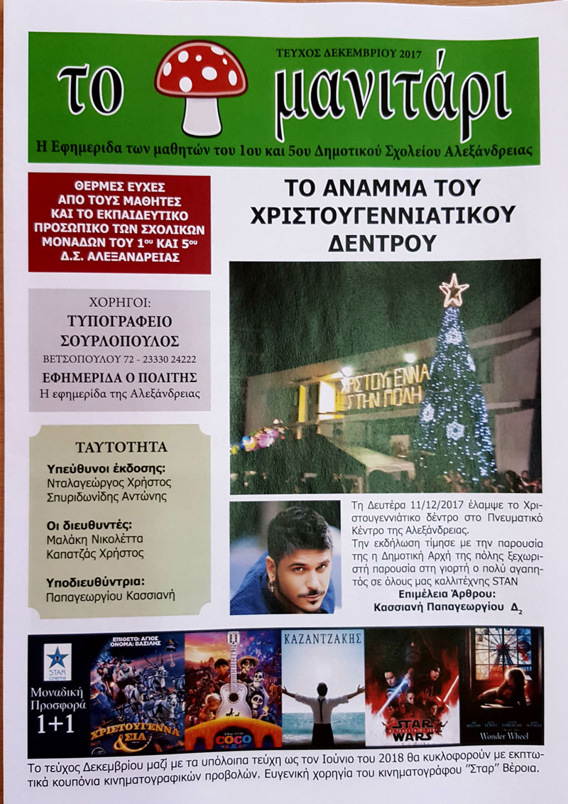 Κυκλοφόρησε το φύλλο Δεκεμβρίου της σχολικής εφημερίδας «Το Μανιτάρι» που εκδίδουν το 1ο και το 5ο Δημοτικά Σχολεία Αλεξάνδρειας.