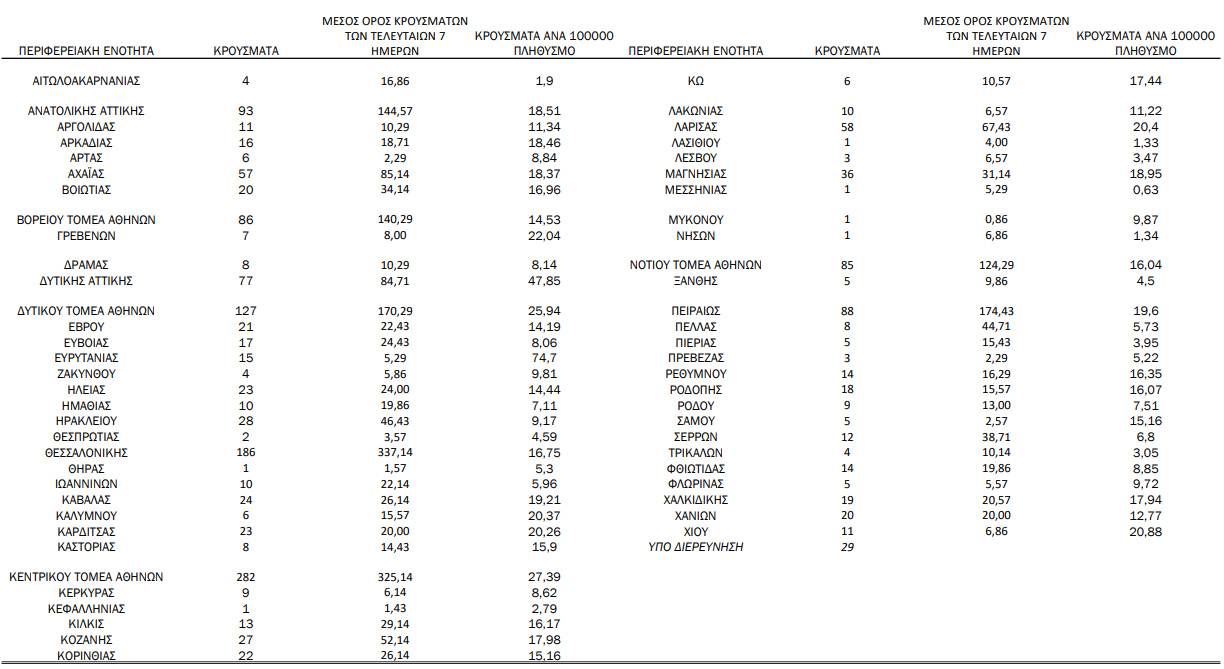 Με βάση τα επιβεβαιωμένα κρούσματα των τελευταίων 7 ημερών, 63 θεωρούνται σχετιζόμενα με ταξίδι από το εξωτερικό και 3.067 είναι σχετιζόμενα με ήδη γνωστό κρούσμα.