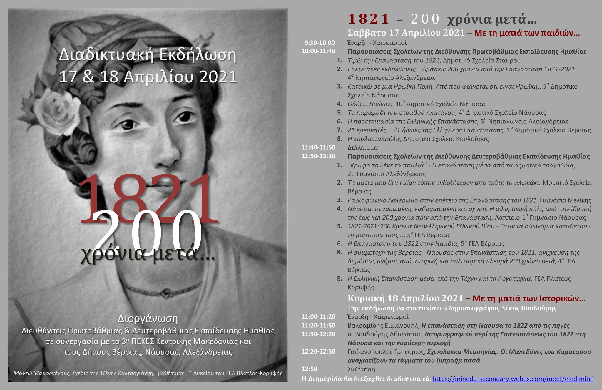 Οι Διευθύνσεις Πρωτοβάθμιας και Δευτεροβάθμιας Εκπαίδευσης Ημαθίας, για τον εορτασμό των 200 χρόνων από το 1821, διοργανώνουν σε συνεργασία με το 3ο Περιφερειακό Κέντρο Εκπαιδευτικού Σχεδιασμού (ΠΕΚΕΣ) Κεντρικής Μακεδονίας και τους Δήμους Βέροιας, Νάουσας και Αλεξάνδρειας, τη Διημερίδα «1821 – 200 χρόνια μετά…».