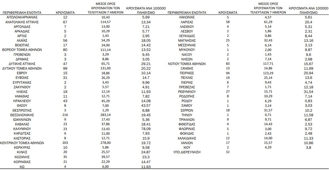 Με βάση τα επιβεβαιωμένα κρούσματα των τελευταίων 7 ημερών, 59 θεωρούνται σχετιζόμενα με ταξίδι από το εξωτερικό και 3.072 είναι σχετιζόμενα με ήδη γνωστό κρούσμα.