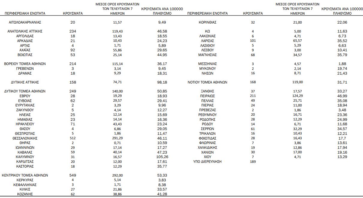 Με βάση τα επιβεβαιωμένα κρούσματα των τελευταίων 7 ημερών, 50 θεωρούνται σχετιζόμενα με ταξίδι από το εξωτερικό και 2.960 είναι σχετιζόμενα με ήδη γνωστό κρούσμα.