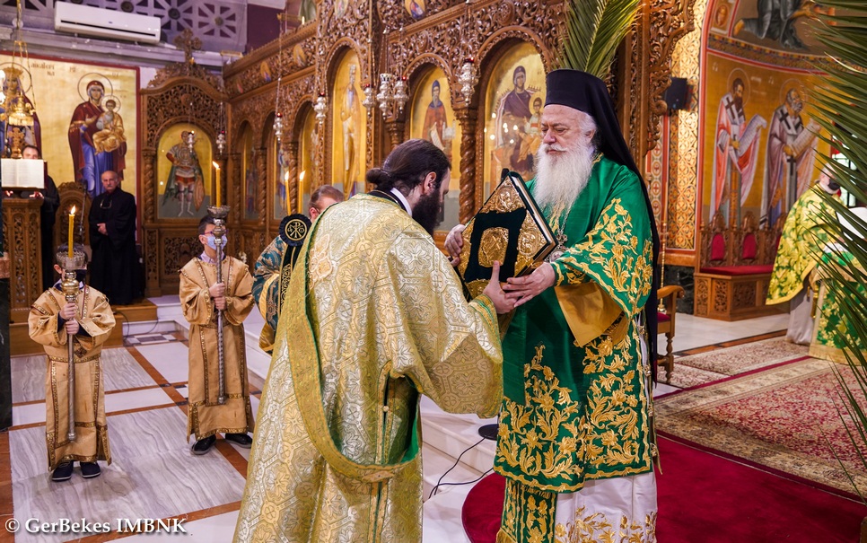 Στο τέλος της Θείας Λειτουργίας πραγματοποιήθηκε εντός του Ιερού Ναού η λιτάνευση της Ιεράς Εικόνας της Βαϊοφόρου και η ανάγνωση της ευχής των Βαΐων.