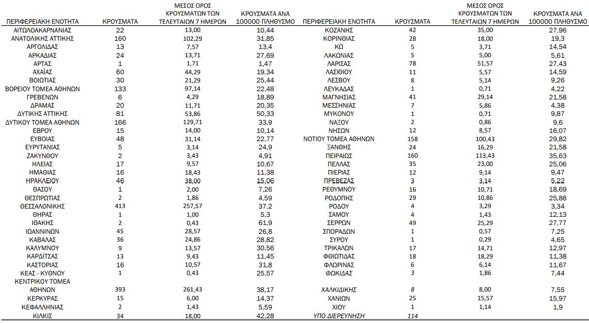 Με βάση τα επιβεβαιωμένα κρούσματα των τελευταίων 7 ημερών, 54 θεωρούνται σχετιζόμενα με ταξίδι από το εξωτερικό και 2.455 είναι σχετιζόμενα με ήδη γνωστό κρούσμα.