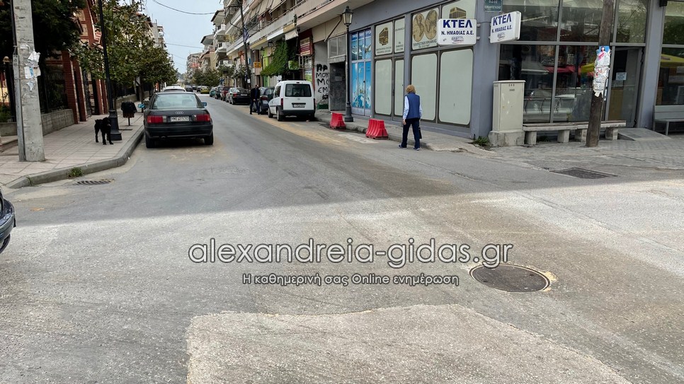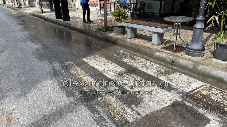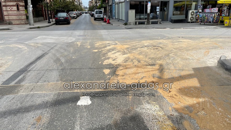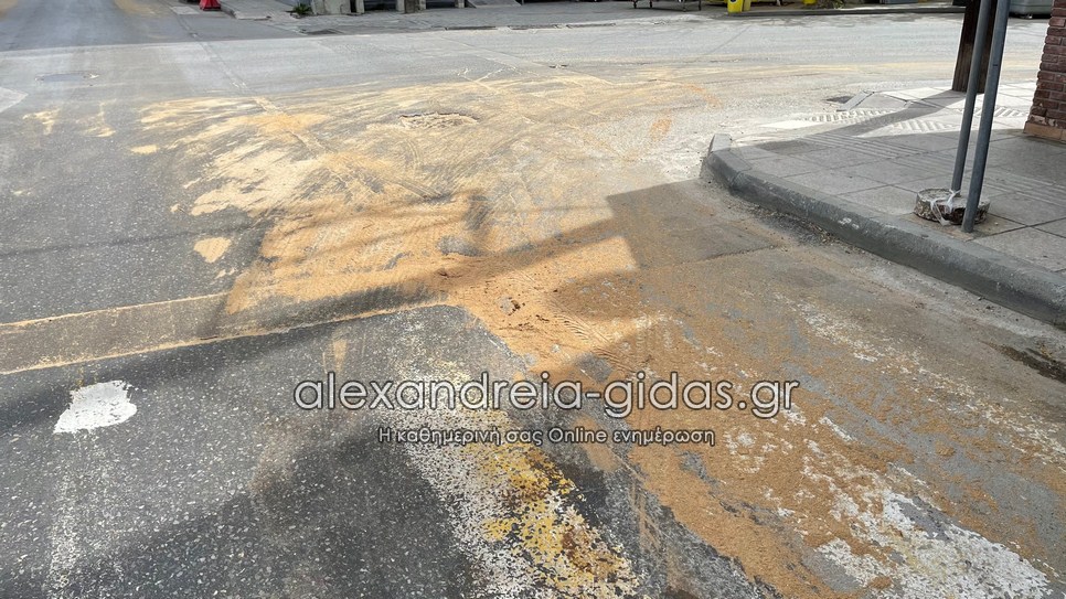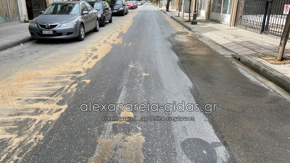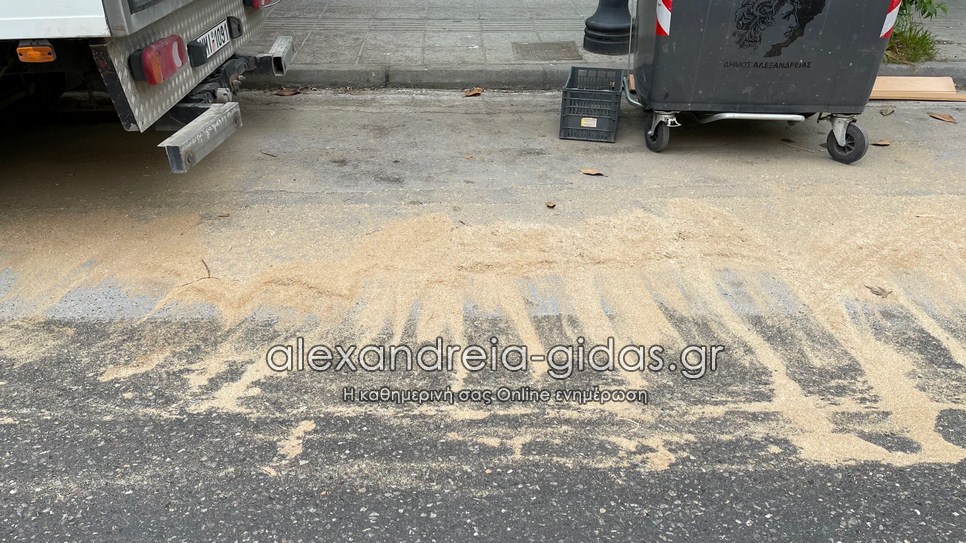 Ο δρόμος γέμισε λάδια και στη συνέχεια ο δήμος Αλεξάνδρειας για την αποφυγή ατυχημάτων (ο δρόμος γλιστρούσε) τα σκέπασε με ροκανίδι.