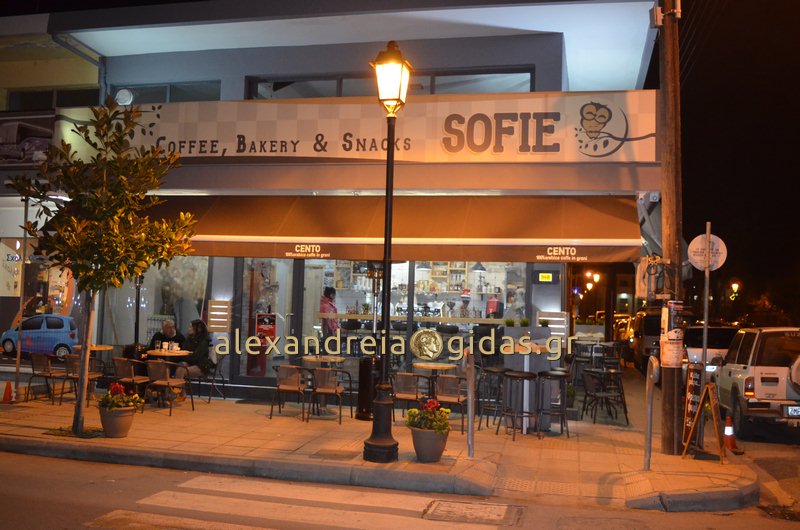 Το καφέ – μπουγάτσα “SOFIE Coffee, Bakery & Snacks” λειτουργεί απέναντι από το ΚΤΕΛ Αλεξάνδρειας στη γωνία της Ν. Πλαστήρα 19.