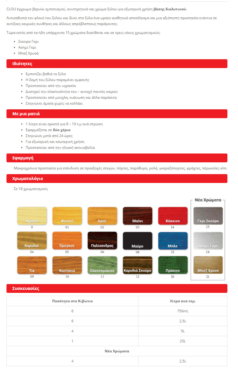 Στις ΧΡΩΜΟΣΥΝΘΕΣΕΙΣ ΣΤΑΜΠΟΥΛΗΣ μπορείτε να βρείτε το CLOU, ένα έγχρωμο βερνίκι εμποτισμού, συντηρητικό και χρώμα ξύλου για εξωτερική χρήση βάσης διαλυτικού.