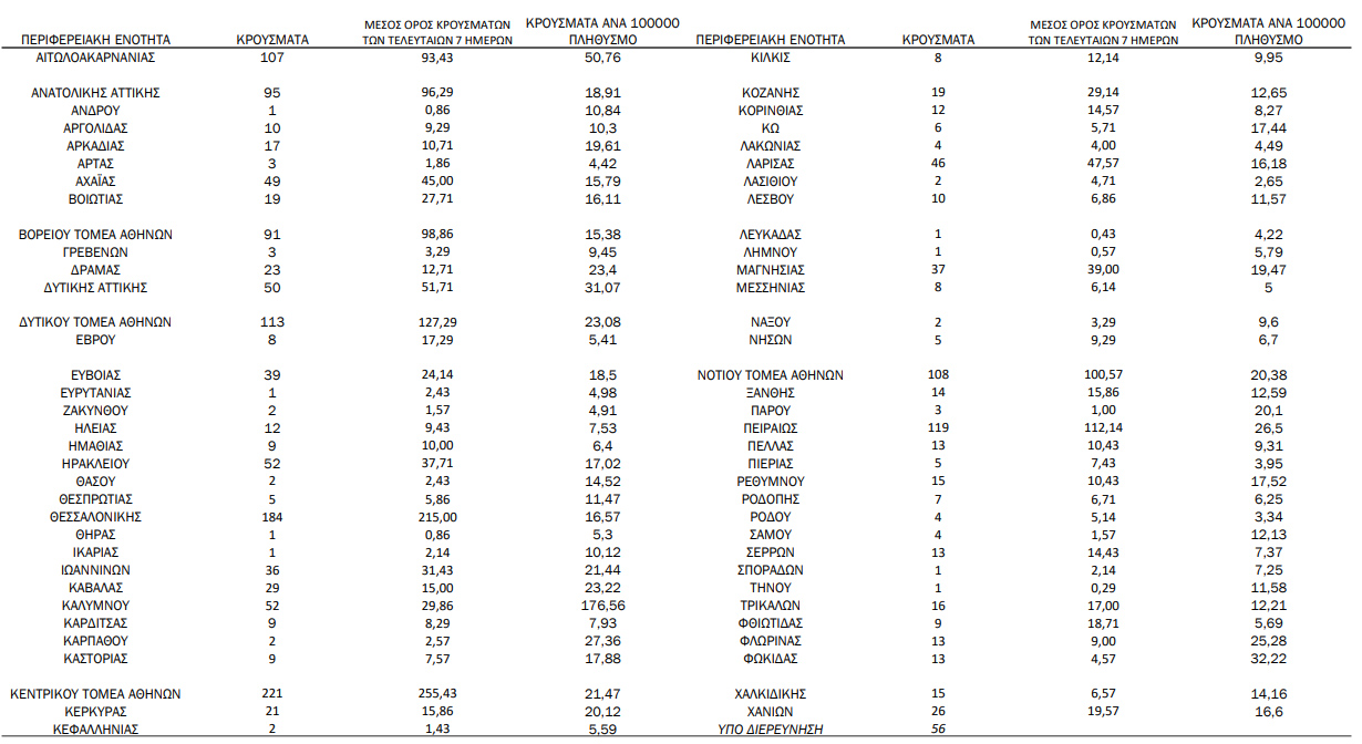 Με βάση τα επιβεβαιωμένα κρούσματα των τελευταίων 7 ημερών, 48 θεωρούνται σχετιζόμενα με ταξίδι από το εξωτερικό και 2.456 είναι σχετιζόμενα με ήδη γνωστό κρούσμα.