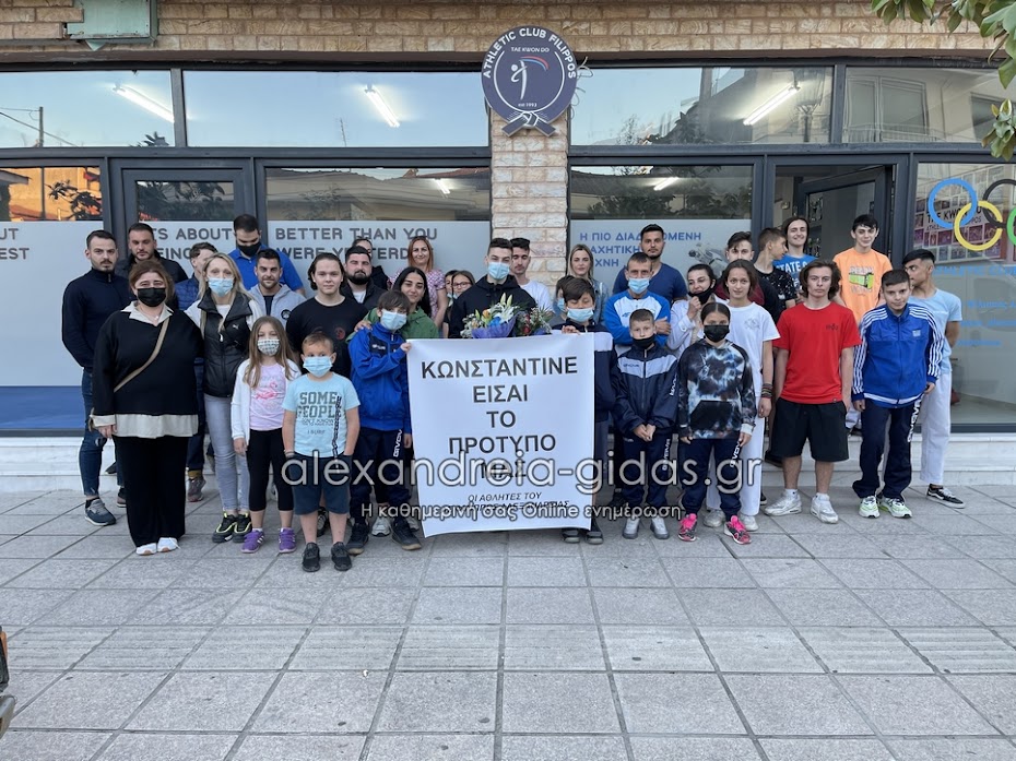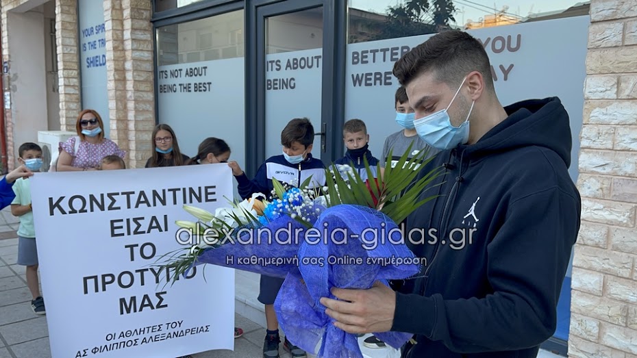 Αθλητές, μαθητές, φίλοι και γονείς του συλλόγου κρατώντας πανό που έγραφε “Κωνσταντίνε είσαι το πρότυπό μας” και φωνάζοντας το όνομά του τον συνάντησαν στις νέες εγκαταστάσεις του ΦΙΛΙΠΠΟΥ Αλεξάνδρειας.