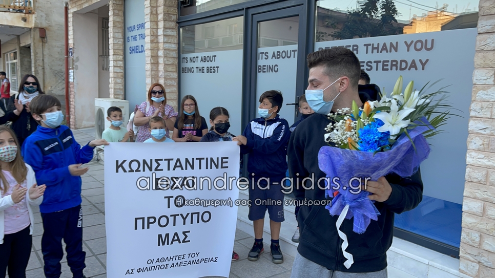Αθλητές, μαθητές, φίλοι και γονείς του συλλόγου κρατώντας πανό που έγραφε “Κωνσταντίνε είσαι το πρότυπό μας” και φωνάζοντας το όνομά του τον συνάντησαν στις νέες εγκαταστάσεις του ΦΙΛΙΠΠΟΥ Αλεξάνδρειας.