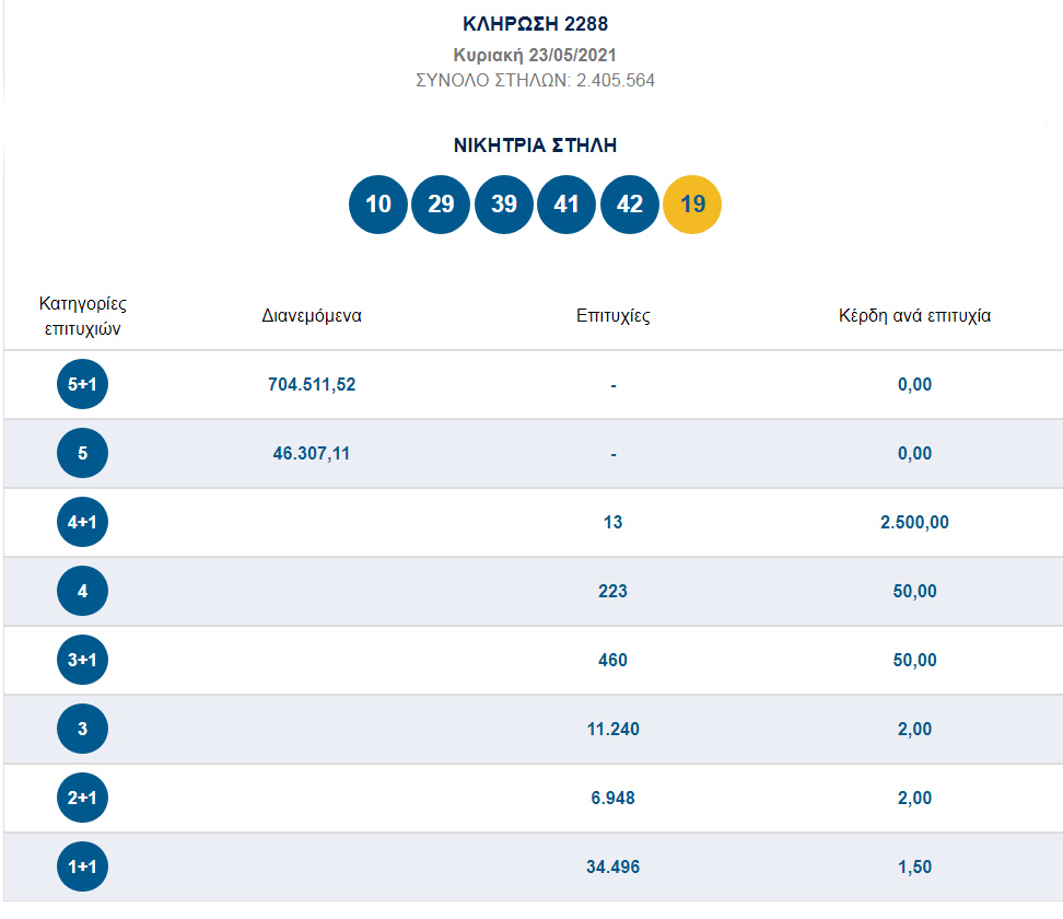 Οι αριθμοί που κληρώθηκαν είναι: 10, 29, 39, 41, 42. Τζόκερ ο αριθμός 19