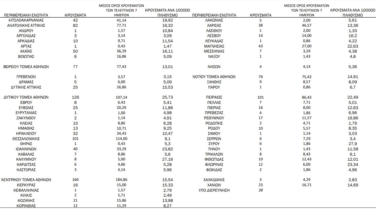 Με βάση τα επιβεβαιωμένα κρούσματα των τελευταίων 7 ημερών, 31 θεωρούνται σχετιζόμενα με ταξίδι από το εξωτερικό και 2.077 είναι σχετιζόμενα με ήδη γνωστό κρούσμα.