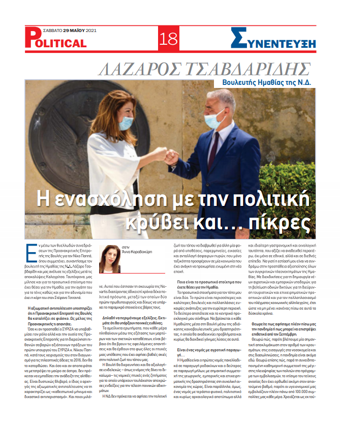 Συνέντευξη στην πολιτική-οικονομική ψηφιακή εφημερίδα Political.gr παραχώρησε ο βουλευτής Ημαθίας της Ν.Δ. Λάζαρος Τσαβδαρίδης.