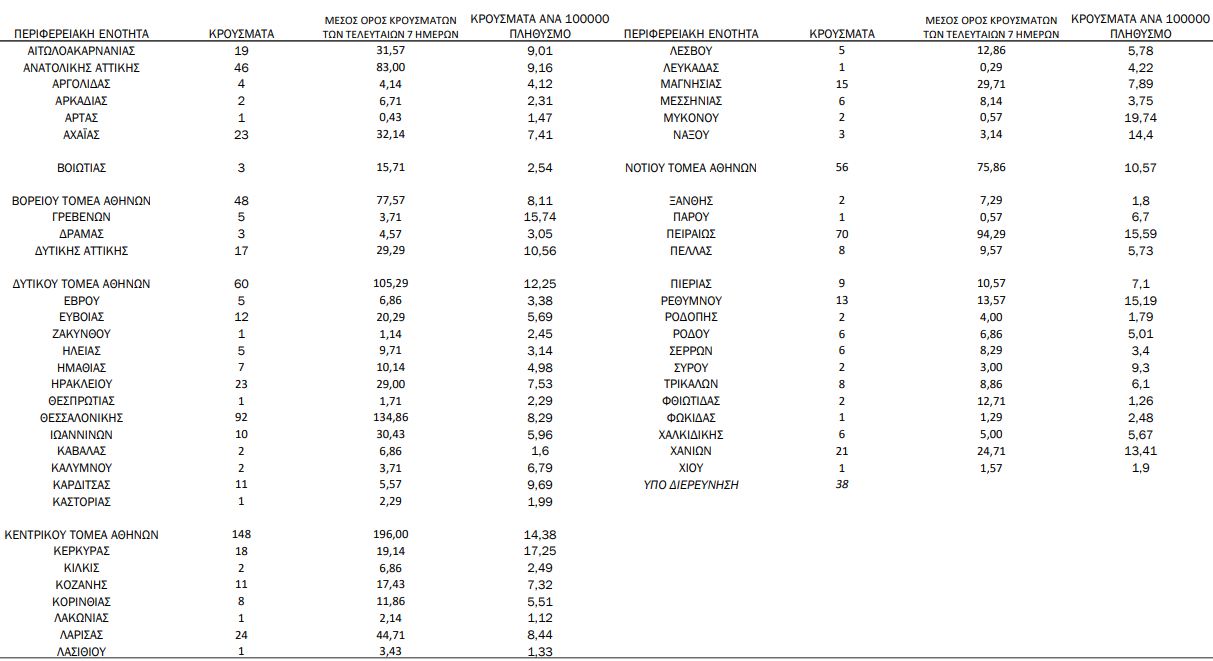 Με βάση τα επιβεβαιωμένα κρούσματα των τελευταίων 7 ημερών, 28 θεωρούνται σχετιζόμενα με ταξίδι από το εξωτερικό και 2.175 είναι σχετιζόμενα με ήδη γνωστό κρούσμα.