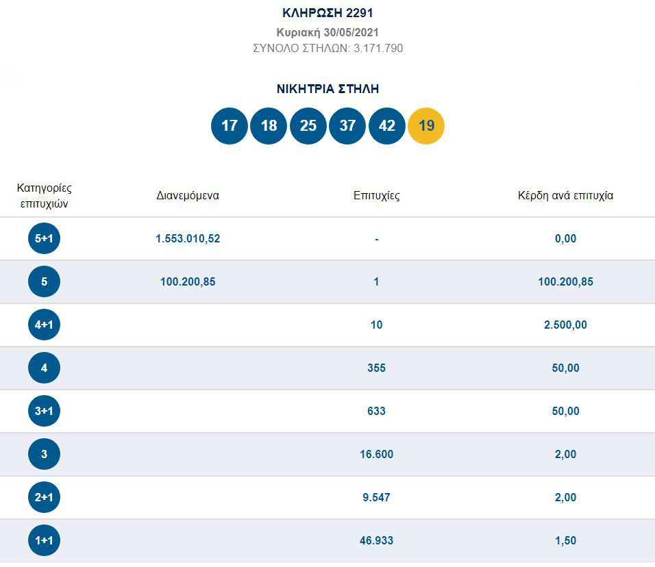 Οι αριθμοί που κληρώθηκαν είναι: 17, 18, 25, 37, 42 και αριθμός Τζόκερ το 19