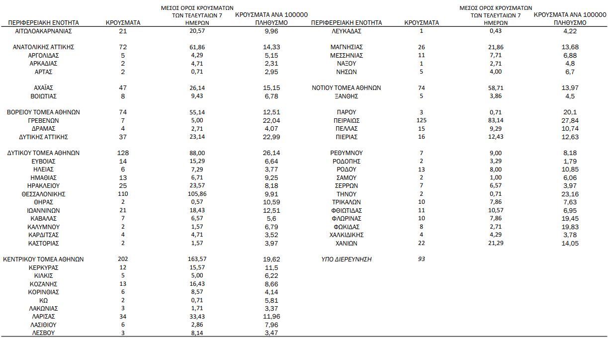 Με βάση τα επιβεβαιωμένα κρούσματα των τελευταίων 7 ημερών, 37 θεωρούνται σχετιζόμενα με ταξίδι από το εξωτερικό και 1.863 είναι σχετιζόμενα με ήδη γνωστό κρούσμα.