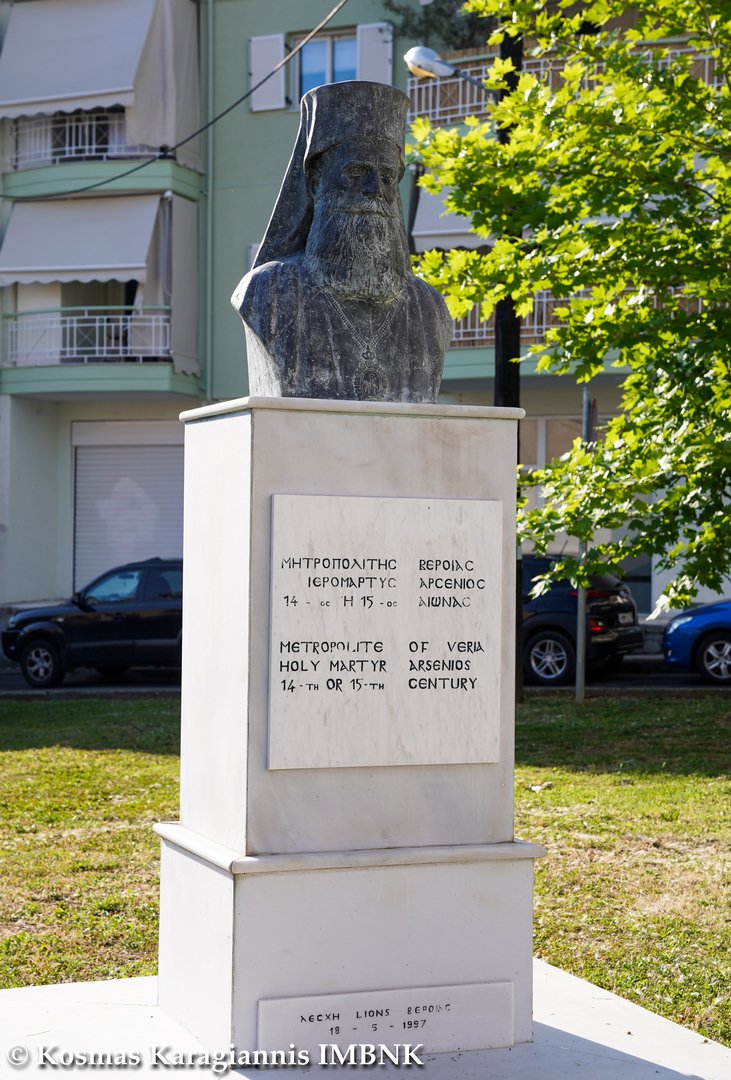 Αὐτό συνέβη καί μέ τόν ἅγιο ἱερομάρτυρα Ἀρσένιο, τόν ὁποῖο συνέλαβαν οἱ Τοῦρκοι μαζί μέ ἄλλους Βεροιεῖς καί τόν ὁδήγησαν ἀρχικά στή φυλακή, ὅπου τόν ὑπέβαλαν σέ φρικτά βασανιστήρια. Ὅμως ἐκεῖνος ὄχι μόνο τά ὑπέμενε καρτερικά, ἀλλά καί ἐνίσχυε τούς συγκρατουμένους του, ὥστε νά μήν δειλιάσουν καί ἀρνηθοῦν τήν πίστη. Καί ὅταν οἱ Τοῦρκοι εἶδαν ὅτι δέν πρόκειται νά ἀρνηθεῖ τόν Χριστό, τότε τόν ὁδήγησαν στό μαρτύριο. Σύμφωνα μάλιστα μέ μία παράδοση τόν κρέμασαν στόν πλάτανο πού βρίσκεται ἔξω ἀπό τόν ναό μας καί ἄφησαν στή συνέχεια ἄταφο τό σῶμα του γιά νά γίνει βορά τῶν πτηνῶν καί τῶν ζώων. Κατά θαυμαστό ὅμως τρόπο παρέμεινε ἀνέπαφο, σύμφωνα μέ τόν λόγο τοῦ ψαλμωδοῦ Δαβίδ ὅτι «φυλάσσει Κύριος πάντα τά ὀστᾶ αὐτῶν», τῶν δικαίων δηλαδή, «ἕν ἐξ αὐτῶν οὐ συντριβήσεται», μέχρι τή στιγμή πού εὐλαβεῖς Βεροιεῖς πῆραν τό ἱερό λείψανό του καί τό ἐνεταφίασαν μέ τίς ἁρμόζουσες τιμές.
