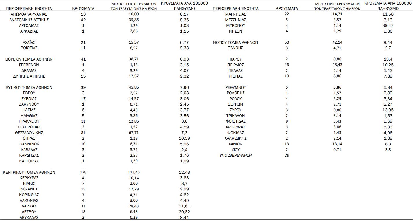 Με βάση τα επιβεβαιωμένα κρούσματα των τελευταίων 7 ημερών, 31 θεωρούνται σχετιζόμενα με ταξίδι από το εξωτερικό και 1.523 είναι σχετιζόμενα με ήδη γνωστό κρούσμα.