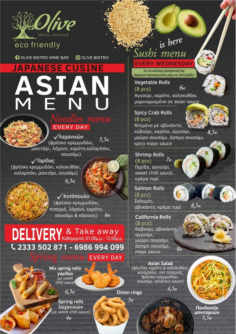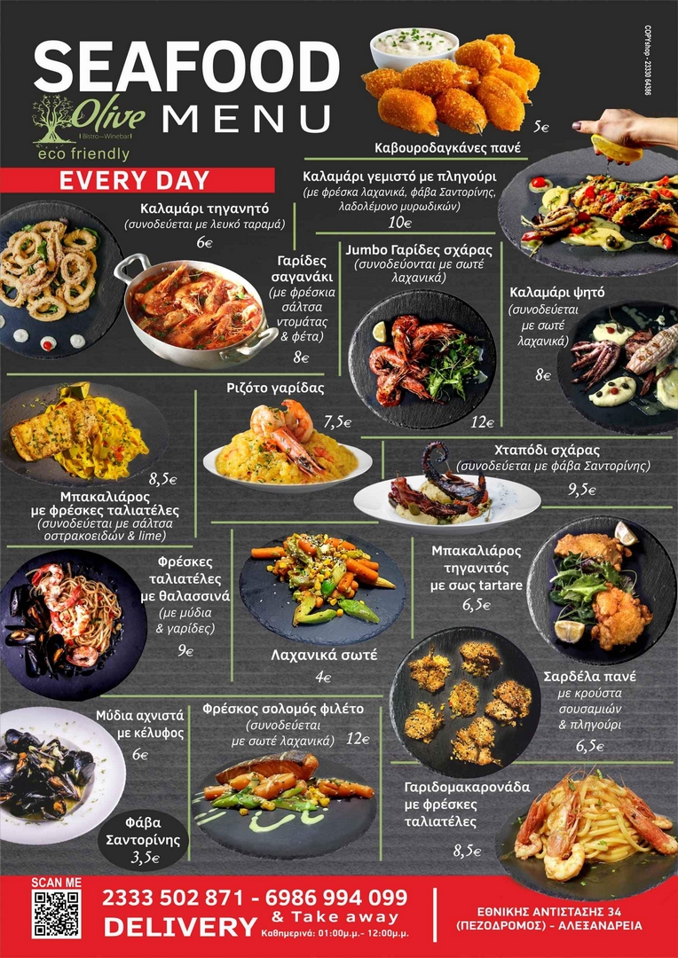Καθημερινά, πλέον από τις 18:00 το απόγευμα έως αργά το βράδυ μπορείτε να απολαύσετε τις υπέροχες γεύσεις στον πανέμορφο χώρο του OLIVE αλλά και με delivery στα τηλέφωνα: 6987388020 – 6981088508 – 2333502871.