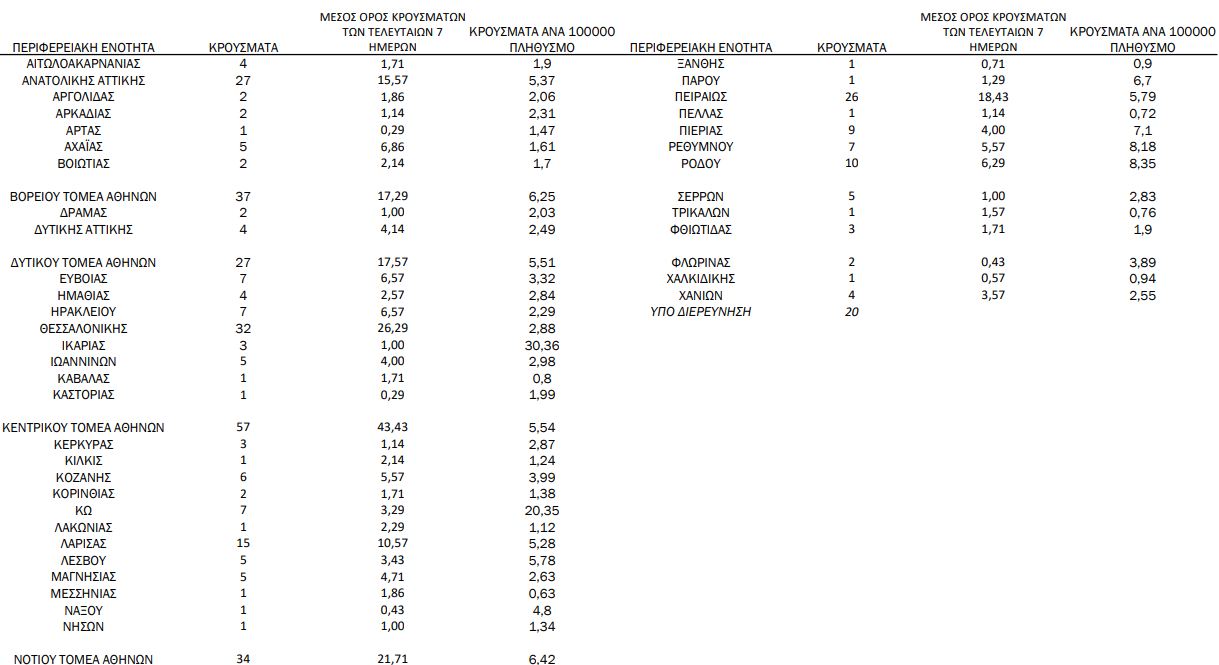 Με βάση τα επιβεβαιωμένα κρούσματα των τελευταίων 7 ημερών, 32 θεωρούνται σχετιζόμενα με ταξίδι από το εξωτερικό και 614 είναι σχετιζόμενα με ήδη γνωστό κρούσμα.