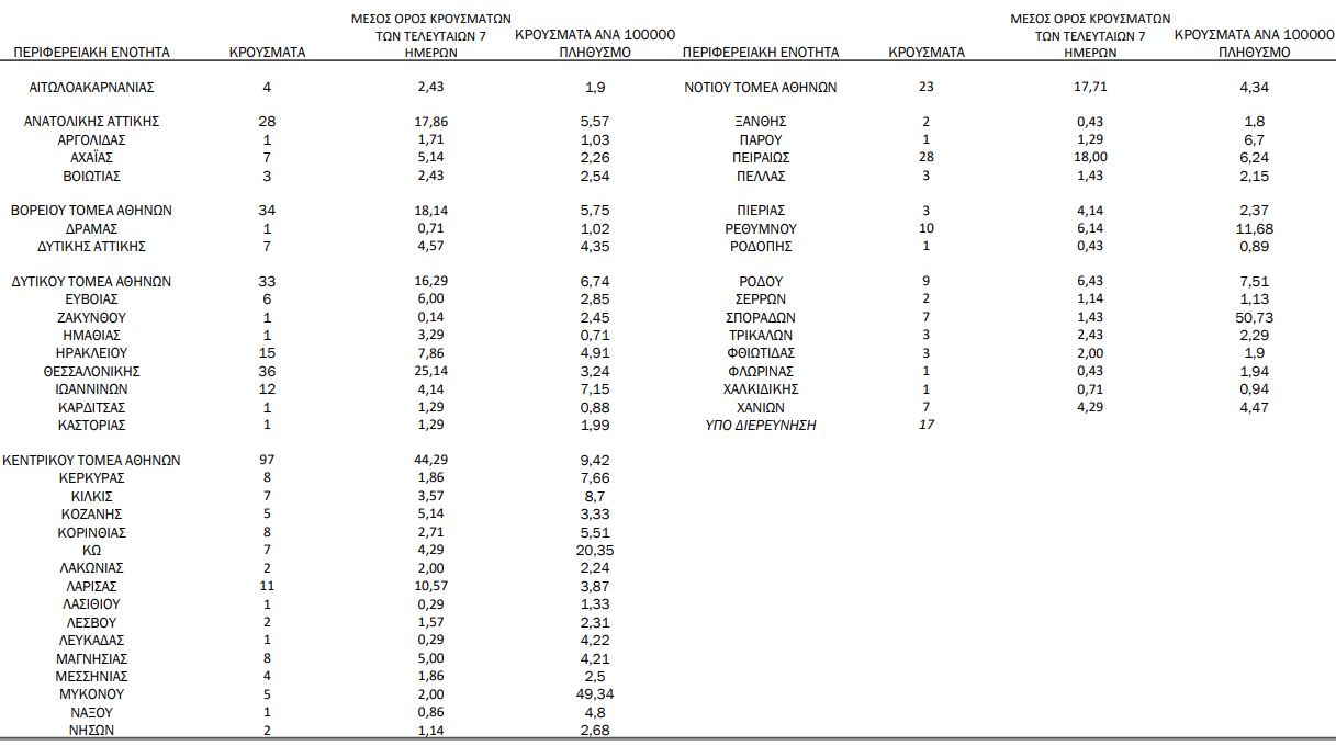 Με βάση τα επιβεβαιωμένα κρούσματα των τελευταίων 7 ημερών, 38 θεωρούνται σχετιζόμενα με ταξίδι από το εξωτερικό και 595 είναι σχετιζόμενα με ήδη γνωστό κρούσμα.